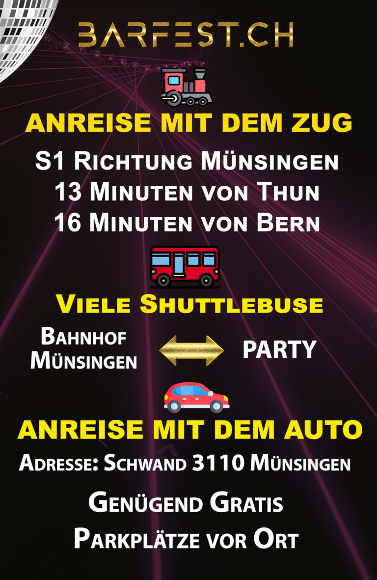 Wir empfehlen die Anreise per Zug nach Bahnhof 3110 Münsingen wo sie unser GRATIS SHUTTLE BUS in Empfang nimmt und Sie direkt zum